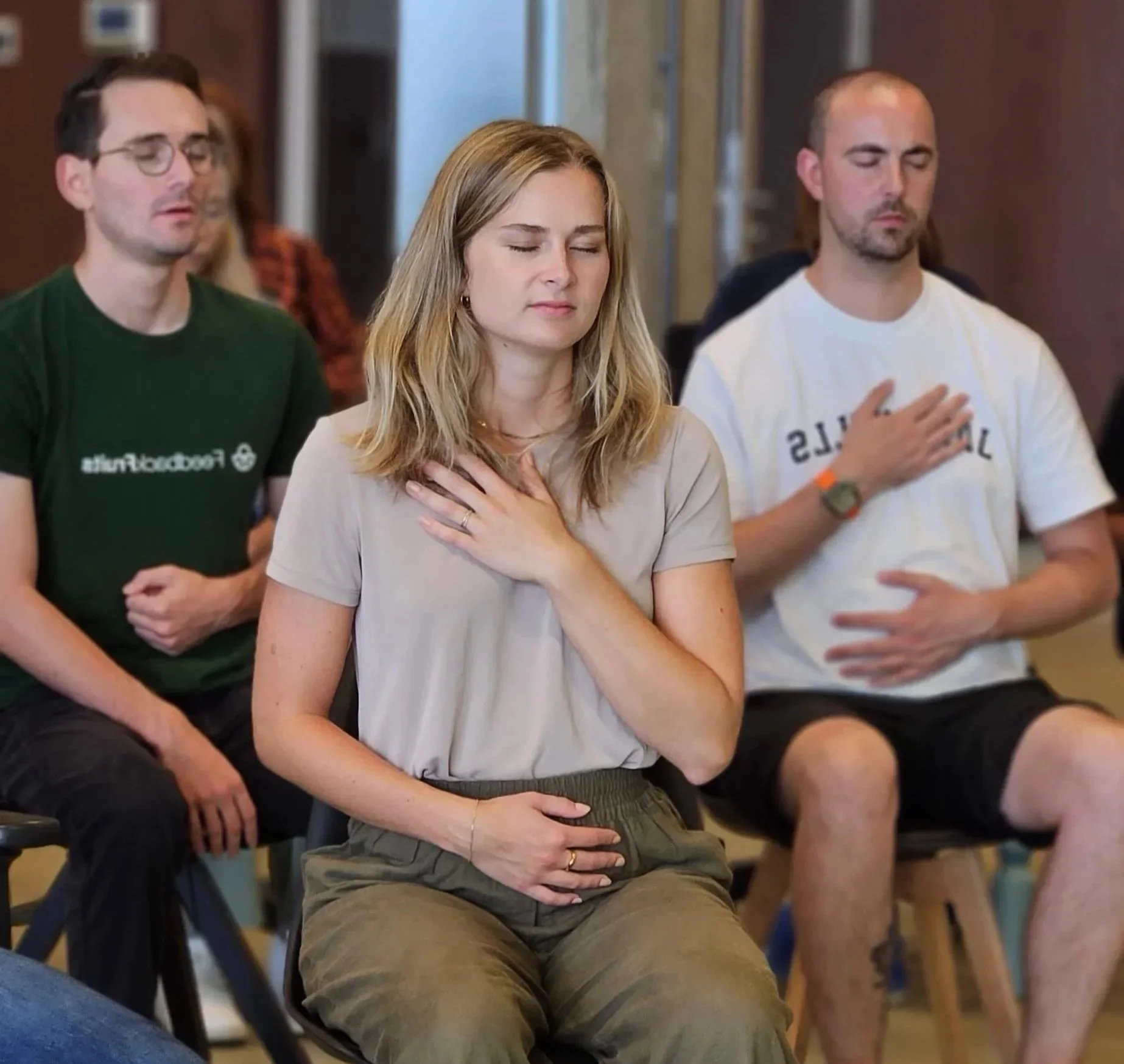 Precies daar passen live interventies zoals breathwork, stoelmassage, meditatie en klanksessies.